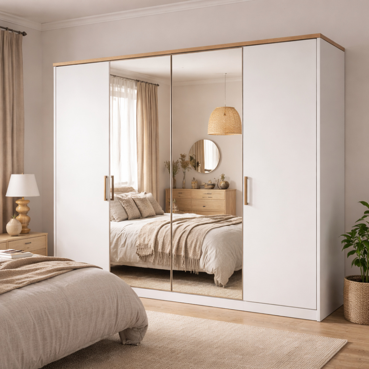 Vergeet niet dat licht een belangrijke rol heeft met betrekking tot spiegels. Een kledingkast spiegel weerkaatst natuurlijk licht, wat vooral in kamers met weinig ramen een groot verschil kan maken. Door de spiegel (en de kast) op de juiste plek te plaatsen, maak je je slaapkamer heel eenvoudig een stuk lichter. Bovendien creëert het reflecterende oppervlak van een spiegel op je kledingkast optisch meer diepte. Hierdoor lijkt een kleine slaapkamer ineens veel groter.