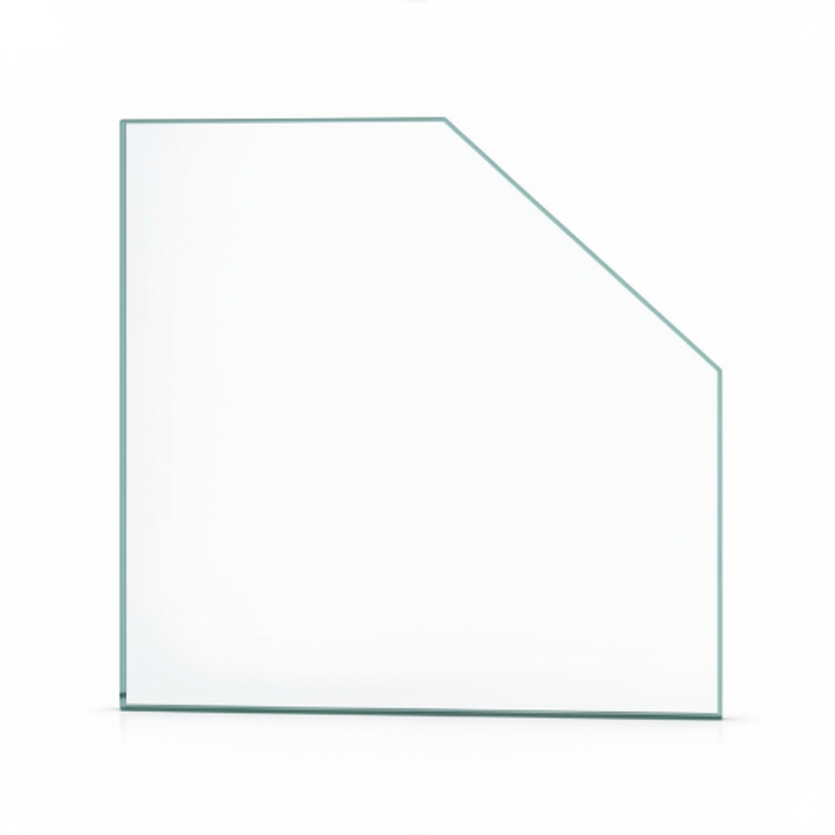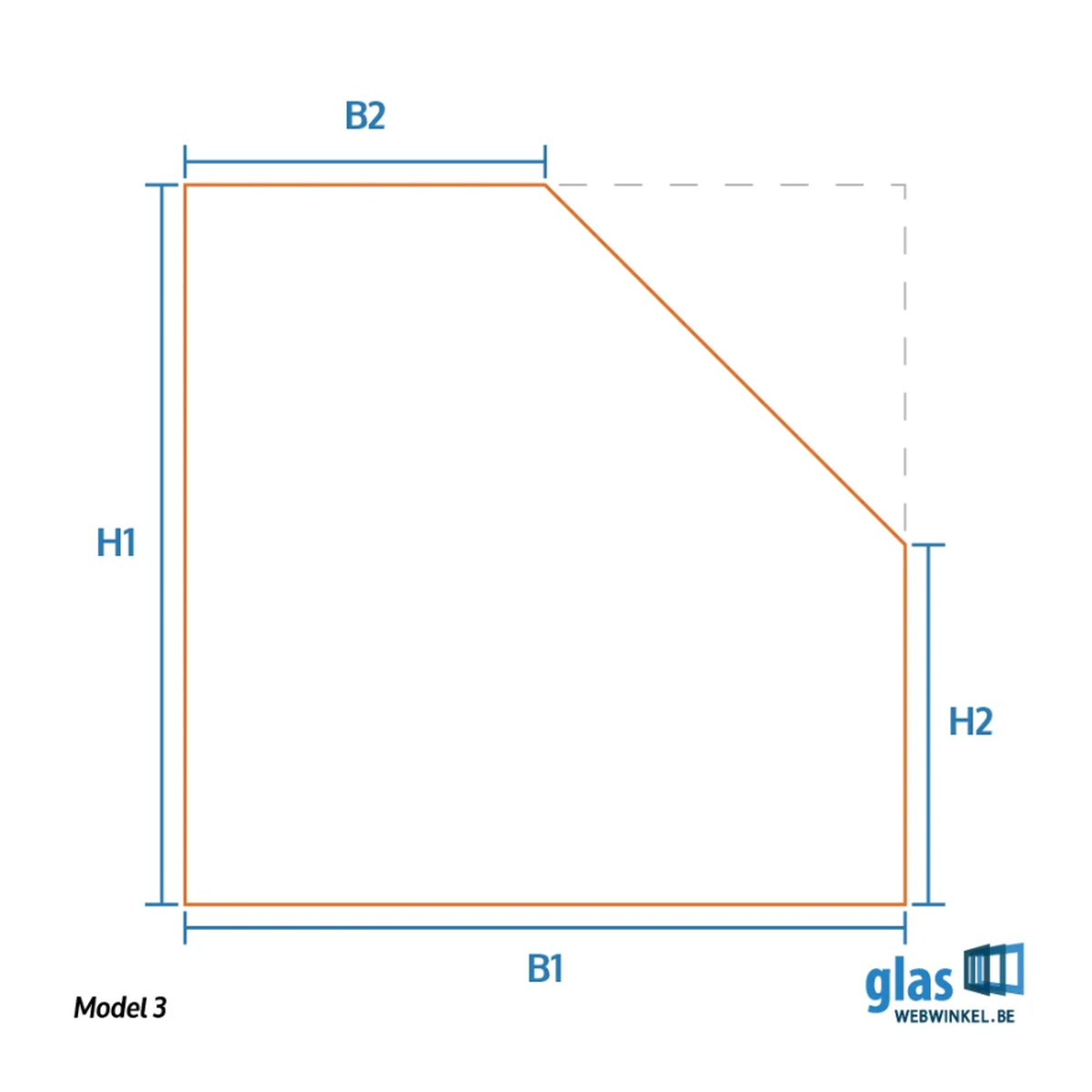 Ben je op zoek naar een glasplaat die geschikt is voor een ruimte met een afwijkende vorm? Dan is dit model met een afschuining aan de rechterzijde een praktische oplossing. In tegenstelling tot standaard glasplaten, sluit dit type glas wél perfect aan bij constructies met een knik of schuine overgang.